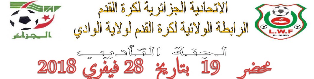 تعلم لجنة الانضباط بالرابطة الولائية لكرة القدم بالوادي  جميع الفرق انها اصدرت المحضر رقم  19 للأطلاع على المحضر يرجى الضغط على:  النشرة الرسمية  لجنة الأنضباط