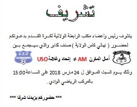 يتشرف رئيس واعضاء مكتب الرابطة الولائية لكرة القدم بالوادي بدعوتكم لحضور نهائي كأس الولاية أكابر والذي سيجمع بين نادي امال المقرن= نادي اتحاد وغلانة يوم السبت 24 مارس 2018الساعة 15H00 مركب الرياضي بالوادي.